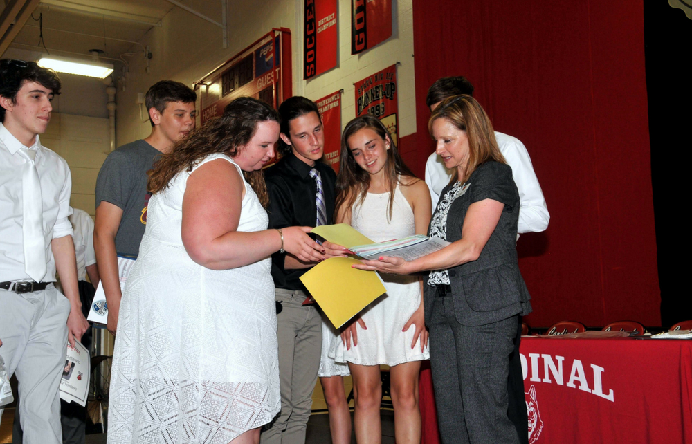 Pictured In Cover Photo: CHS Principal Dr. Jennifer Sabol (right) shares time capsule items with students Olin Nishizaki, David Braun, Taylor Kolat, Todd Wright, Megan Maddox, and Joey Bradesca at Senior Awards. Students made the capsule items when they were Kindergarteners at Huntsburg Elementary.