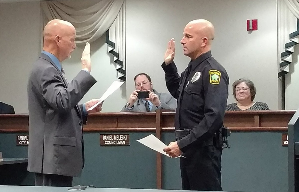 Pictured In Cover Photo: A swearing in ceremony for Chardon SRO Officer and newly promoted Police Sergeant Mike Shaw was held prior to the Chardon City Council meeting on Thursday, November 8th. Sergeant Shaw was sworn in by by Mayor Jeff Smock.