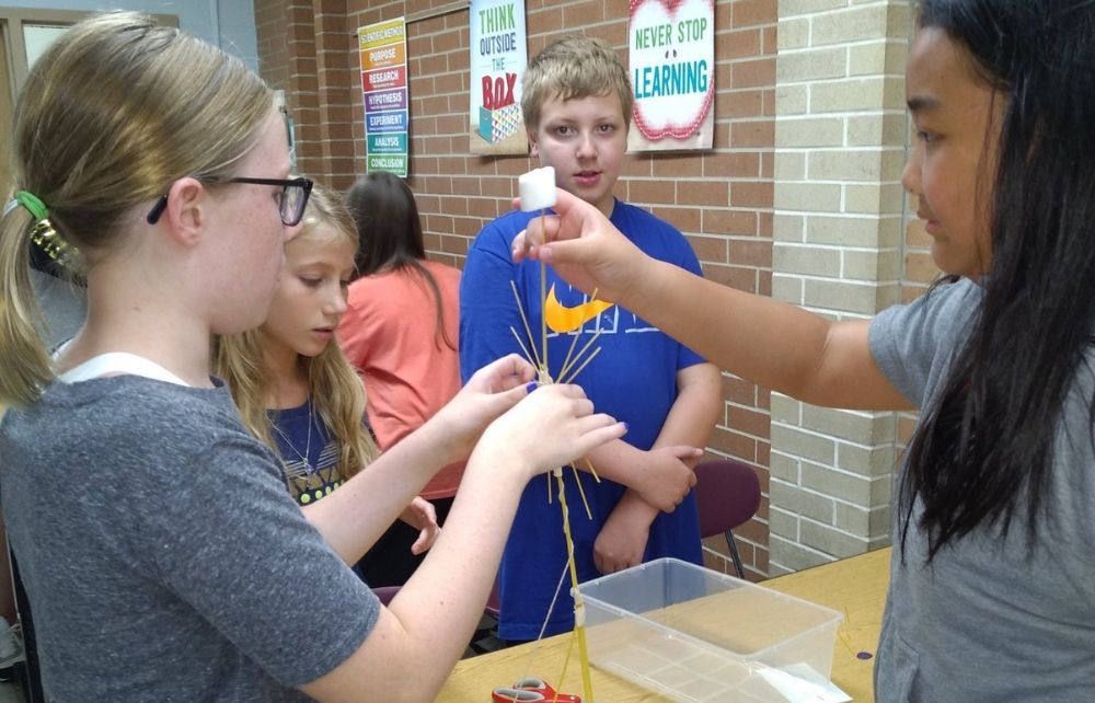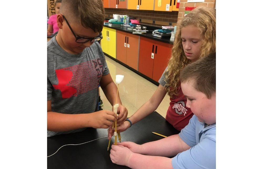 Mrs. Mele’s fifth grade Chardon Middle School students (pictured on right) work in teams on the “spaghetti marshmallow tower challenge” to see which group can build the tallest structure in just 18 minutes. Mrs. Brown’s fifth grade Chardon Middle School students (pictured on left) work in teams on the “spaghetti marshmallow tower challenge” to see which group can build the tallest structure in just 18 minutes. “It’s harder than you think,” said fifth grade teacher Mrs. Brown.
