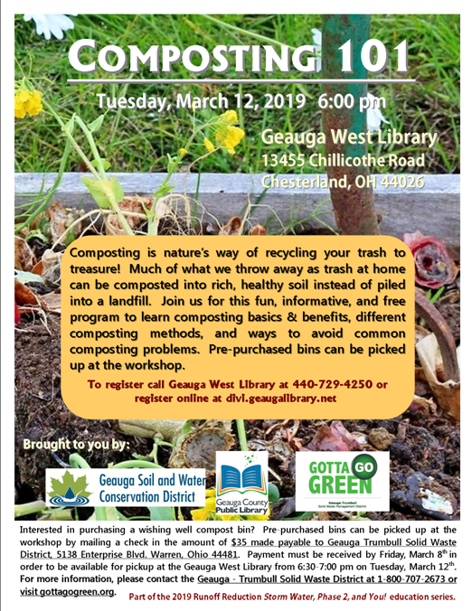 Join us on Tuesday, March 12th at 6:00 p.m. for Composting 101 at the Geauga West Library, 13455 Chillicothe Road, Chesterland 44026. Learn composting basics and benefits, different composting methods, and how to avoid common composting problems. To register contact the Geauga West Library at 440-729-4250 or register online at