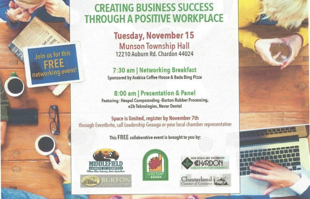 Space is limited so register before the November 7th deadline through eventbrite: http://www.eventbrite.com/e/creating-business-success-through-a-positive-workplace-tickets-27389879868 or call Leadership Geauga at 440-286-8115