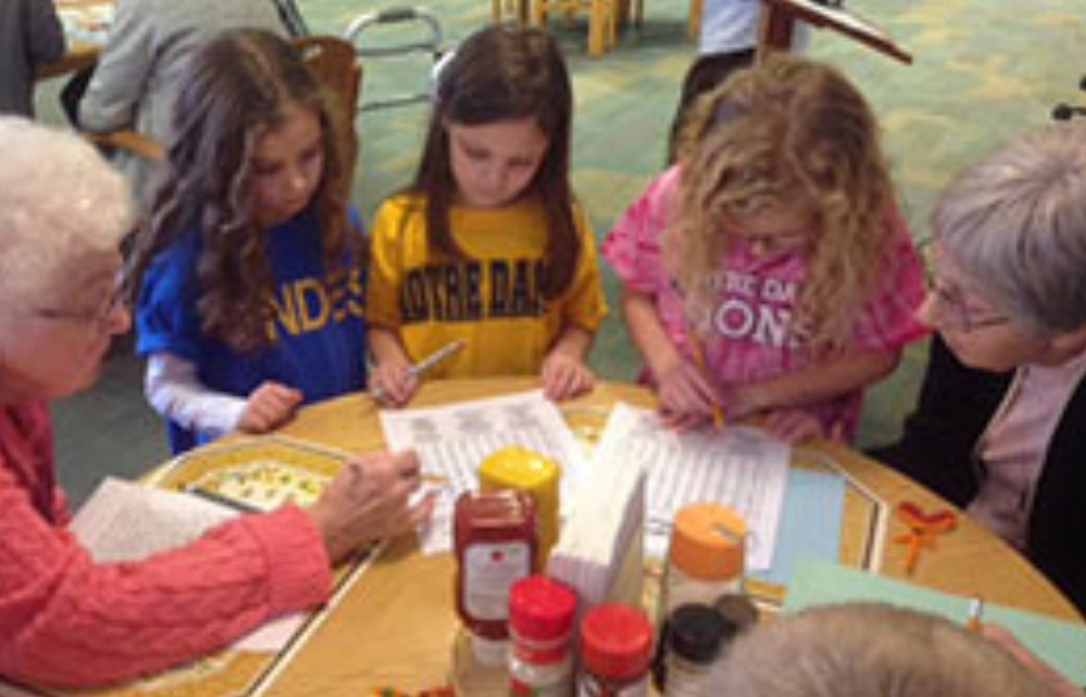 Students in Mrs. Biro’s first grade class enjoyed visiting the Sisters of Notre Dame Health Care Center. The students made rosaries to give to each Sister. They sang a thank you song, gave them a card and completed word searches. They ended their time together by praying a Hail Mary.​