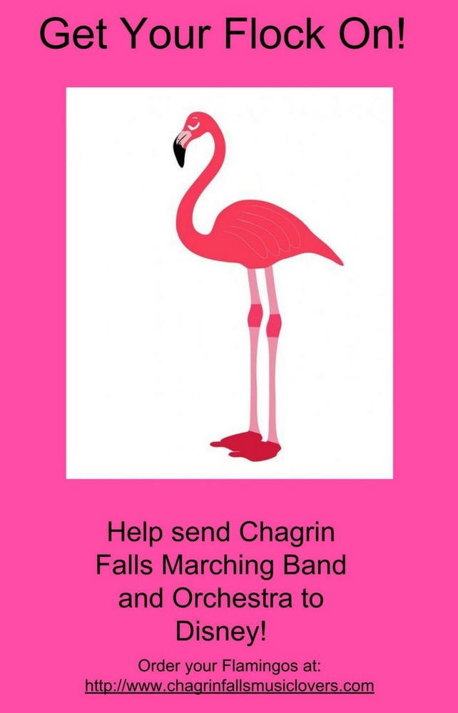 The fundraiser is for the Chagrin Falls Band and Orchestra trip to perform at Walt Disney World in November. Flocks of flamingos will move around the Chagrin Falls Schools’ community from Friday, April 13th to Sunday, April 22nd. A donation of $20 or more will send a flock to friends or family. If you wake up in the morning with a flock in your yard, a donation of $10 will take the flock away. For a donation of over $10, the flock will be taken away and you can choose the next friend or family to be flocked. Flock-Me-Not Insurance will also be offered for those who would like to support the band and orchestra trip to Disney and would rather not have flamingos in their yard. Suggested donation is $25. If you do not want to participate at all, simply call the Flocking Hot Line and we will place you on the Do-Not- Flock list and they will never make a visit to your yard.