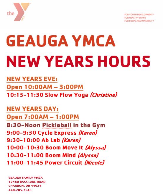 Due to the New Years holiday, the Geauga Family YMCA will be open, but will jhave limited hours and classes on Sunday, December 31st and Monday, January 1st. They will be open from 10:00 a.m. – 3:00 p.m. on Sunday, December 31st and 7:00 a.m. – 1:00 p.m. on Monday, January 1st.