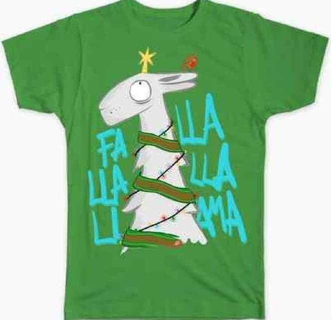 He’s a 34-year-old artist who used to do street graffiti under the tag “llamaphish” using llamas or a goldfish in an Army helmet, depending on his mood. Now, he’s selling a T-shirt of his own design in — count ‘em — 40 different colors with a goofy, bug-eyed llama as a Christmas tree itself, a topper star on his head, lights and garland wrapped around him, wishing all: “Fa lla lla lla llama.”