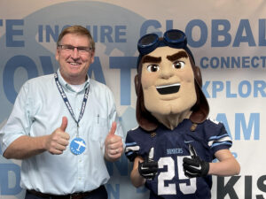 Kenston mascot Billy the Bomber and Interim Superintendent Mr. Steve Sayers were excited to greet students as they returned to the building to meet their teachers before the start of school.