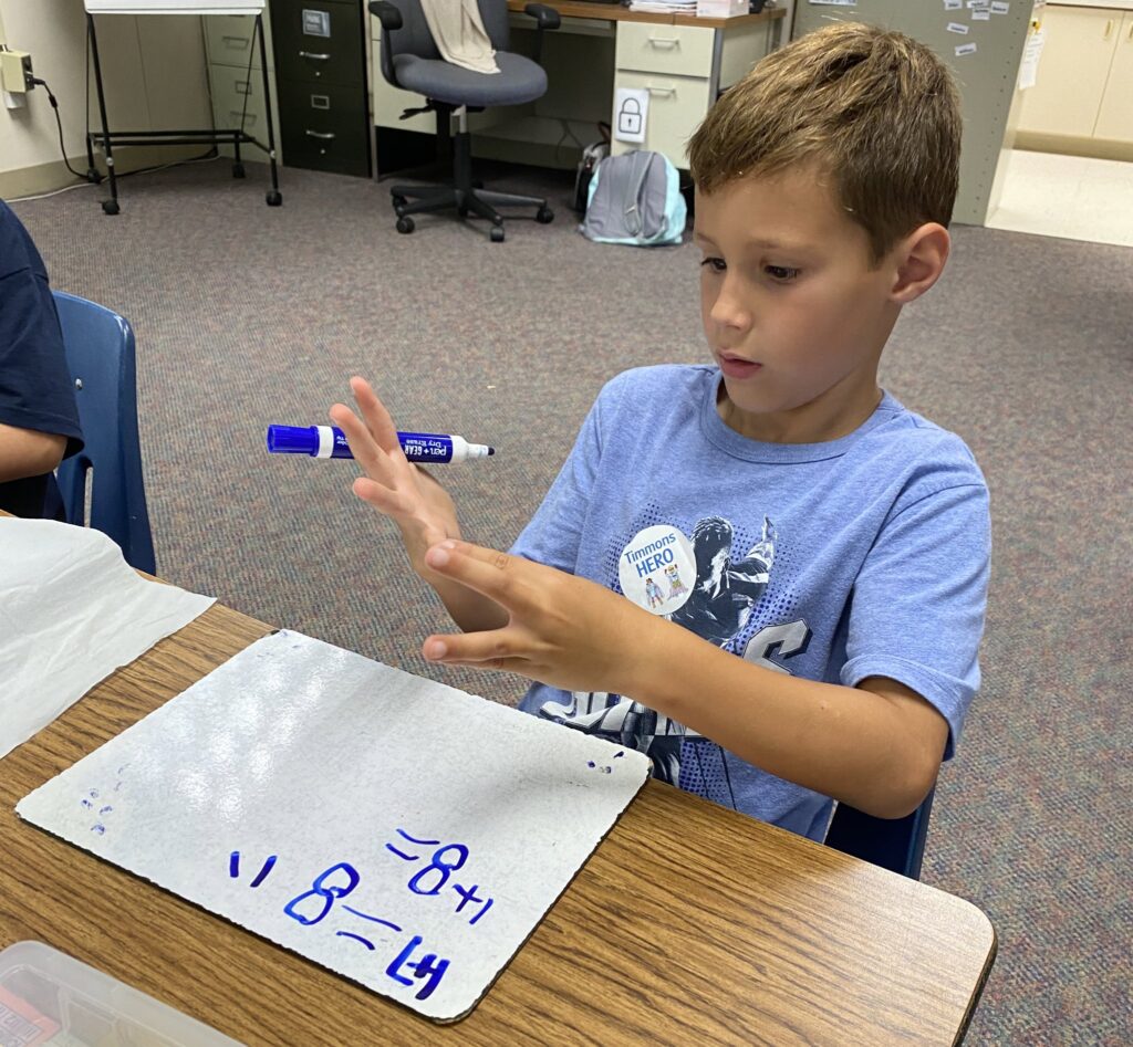 Check out first grader Luke Senedak who is showing off his math problem-solving skills as he creates and solves equations representing combinations of eight. Students also used their math skills to play “Sorry.”