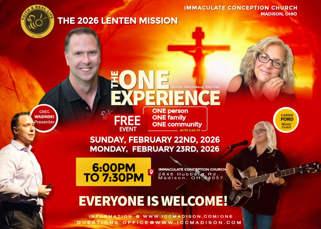 You and your family are invited to a two day Lenten misson on Sunday, February 22nd, 2026 – Monday, February 23rd, 2026 at Immaculate Conception Church.