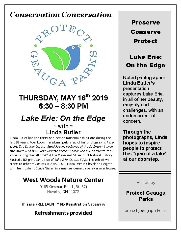 Protect Geauga Parks, non-profit Conservation organization, hosts a photographic presentation by Linda Butler, noted photographer, that captures Lake Erie, in all of her beauty, majesty and challenges, with an undercurrent of concern. Through the photographs Linda hopes to inspire people to protect this “gem of a lake” at our doorstep.