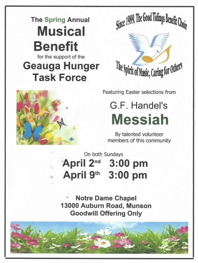 The Good Tiding Benefit Choir invites you to listen for a cause. This all volunteer ecumenical choir formed 28 years ago to help the local food banks through the work of the Geauga Hunger Task Force (GHTF). The Choir will continue their legacy of raising spirits and funds by performing the Easter sections of GF Handel’s “Messiah.” The two performances of this timeless Oratorio will be Sundays, April 2nd and April 9th at 3:00 p.m. at Notre Dame Chapel, 13000 Auburn Road in Munson. There is no charge or reservations for the performances but a goodwill offering will be taken. All attendees will also be invited to join in the Hallelujah chorus.