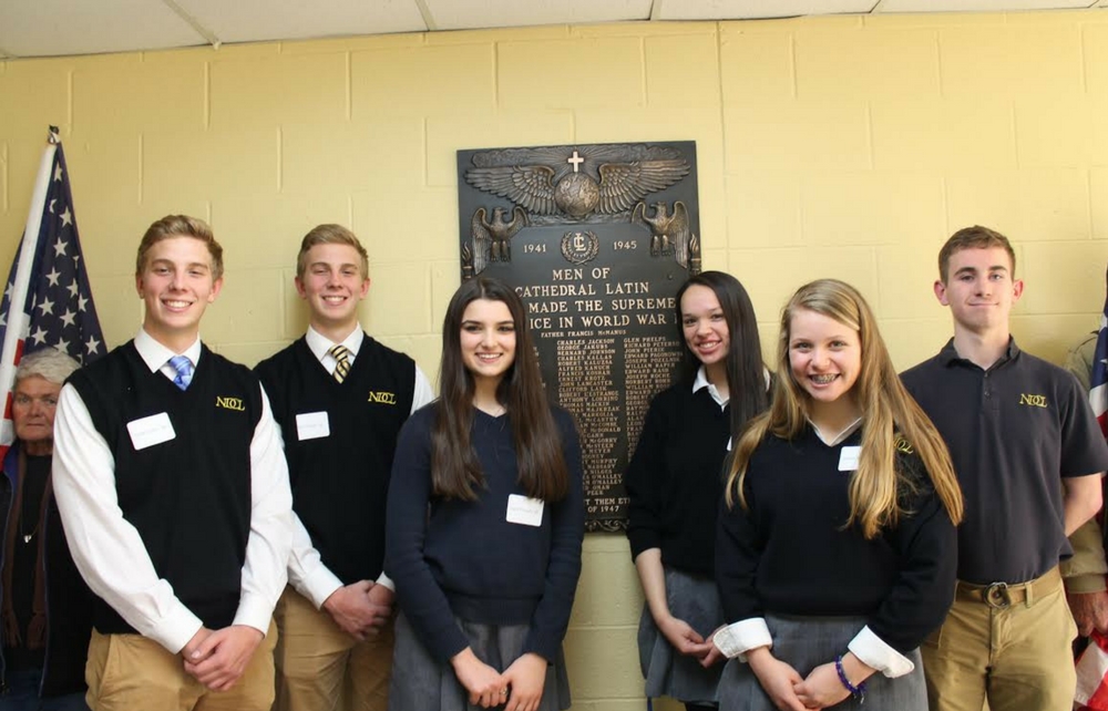 NDCL students, Eddie Zucker ’18, Dan Zucker ’18, Julia Tripodo ’20, Erin Brownlee ’17, Nicole Grosel ’20, and David Mele ’18 join in the Blessing Ceremony of the refurbished World World II Plaque honoring Cathedral Latin Veterans now housed at Notre Dame-Cathedral Latin School.