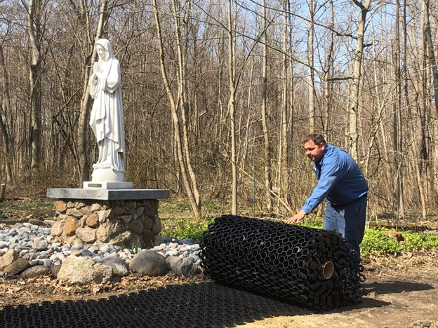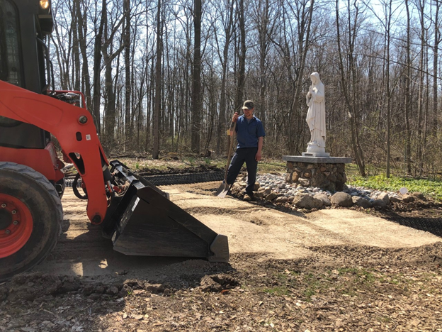 Thank you to the Notre Dame Maintenance staff who worked very hard during the first three days of Easter week to convert a very muddy old waterline pathway to become an ADA accessible trail. Everyone can now enjoy the wonderful beauty of God’s creation! The outdoor classroom and shrine to Mary is a great place to learn and to pray! God is Good! Thank you to Sr. Barbara Soplata and her family for providing us with this beautiful outdoor resource!