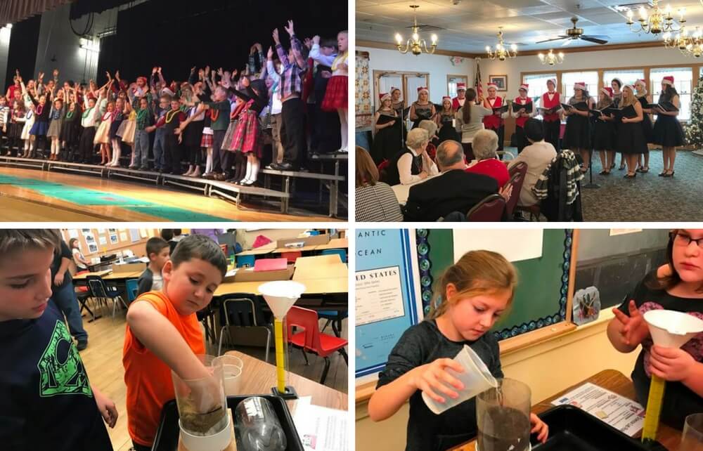 Pictured In Top Left Photo: Our 1st and 2nd grade students put on an outstanding winter concert December 5th. Students have been working hard learning their songs and all of their efforts definitely paid off – they were quite the entertainers! Congratulations students and Mr. Kithcart on fantastic performances!