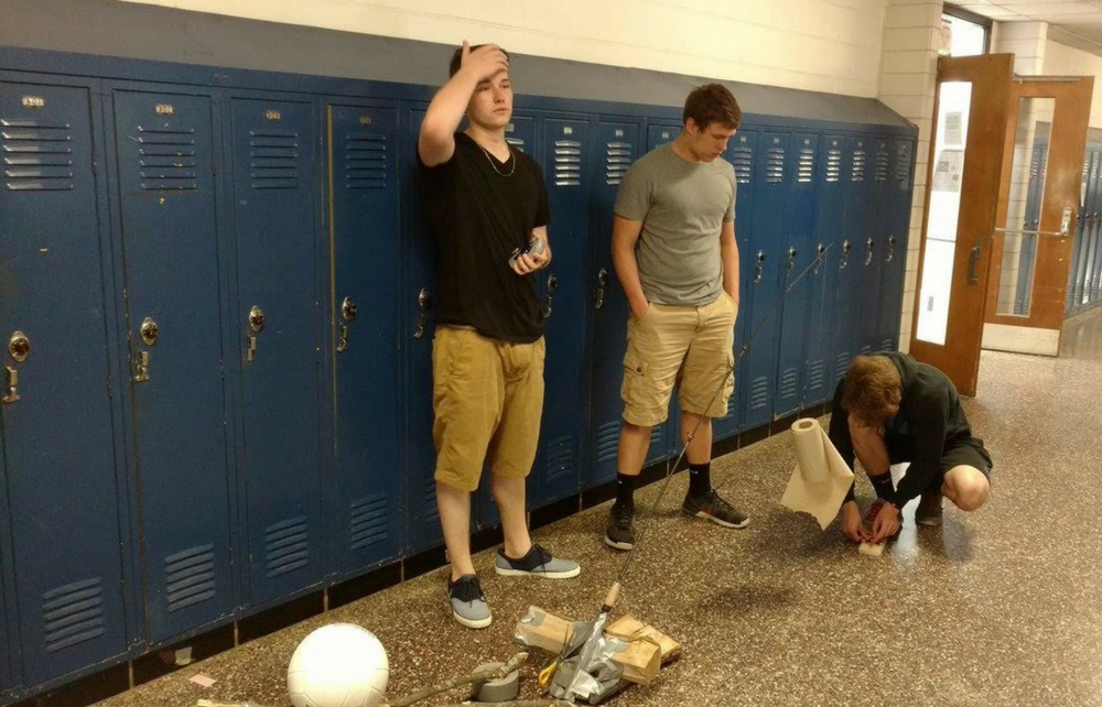 Pictured In Photo: Joe S., Kyle S., and Addison D., work to set up a Rube Goldberg machine for a physics class assignment. Students were testing their machines to determine if they could set off a landmine at a camping site while being far enough away to be safe.