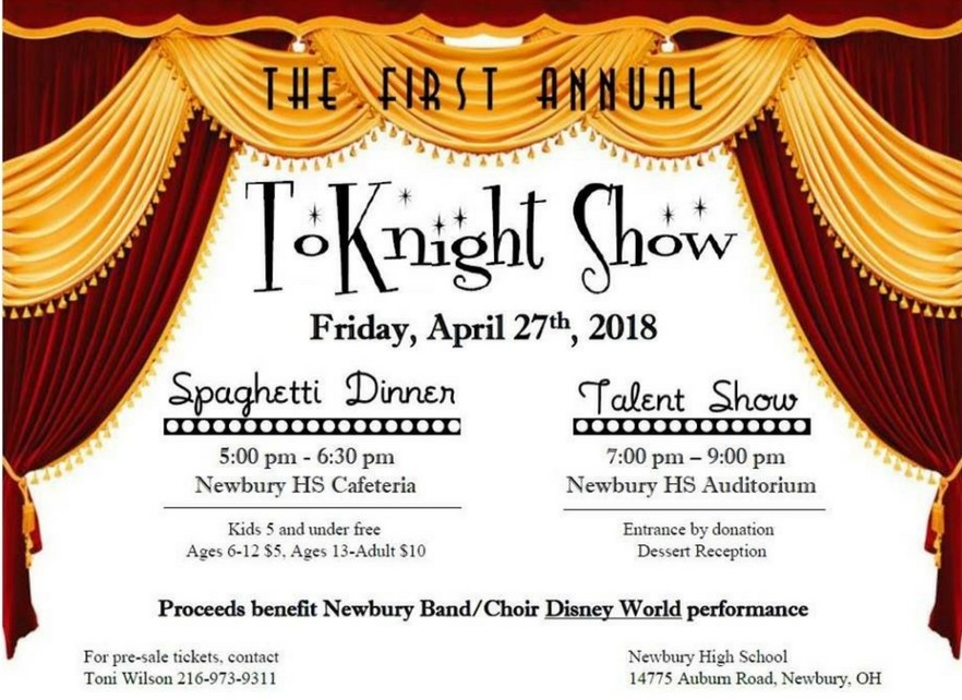 The Newbury high school band and choir department will be hosting a spaghetti dinner and community talent show as a fundraiser for their performance in Disney World next year. The fundraiser, entitled the “ToKnight Show”, will take place on Friday, April 27th.