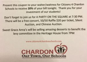 Proceeds donated to Citizens for Chardon Schools. Updated details and more participating restaurants at Citizens for Chardon Schools