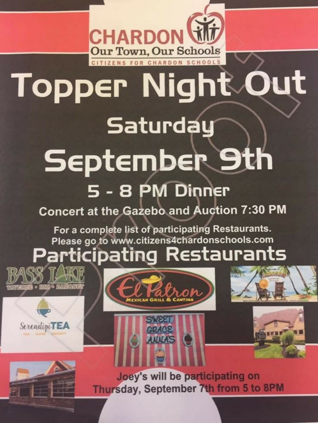 Join Citizens for Chardon Schools for a Topper Night Out on Chardon Square Saturday, September 9th. Dine at local restaurants from 5:00 p.m. – 8:00 p.m. Free concert, dessert and raffles on the square from 6:00 p.m. – 8:30 p.m. Don’t miss the 50/50 cash raffle, and a chance to win one of over 50 raffle baskets! There’s something for everyone, including lunch with one of Chardon’s principals, $500 off a home improvement project to theater tickets and music lessons!